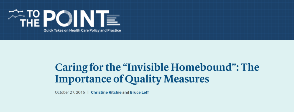 Ritchie CS, Leff B. Caring for the “invisible homebound”: The importance of quality measures. The Commonwealth Fund – To the Point Blog. 10/27/2016.